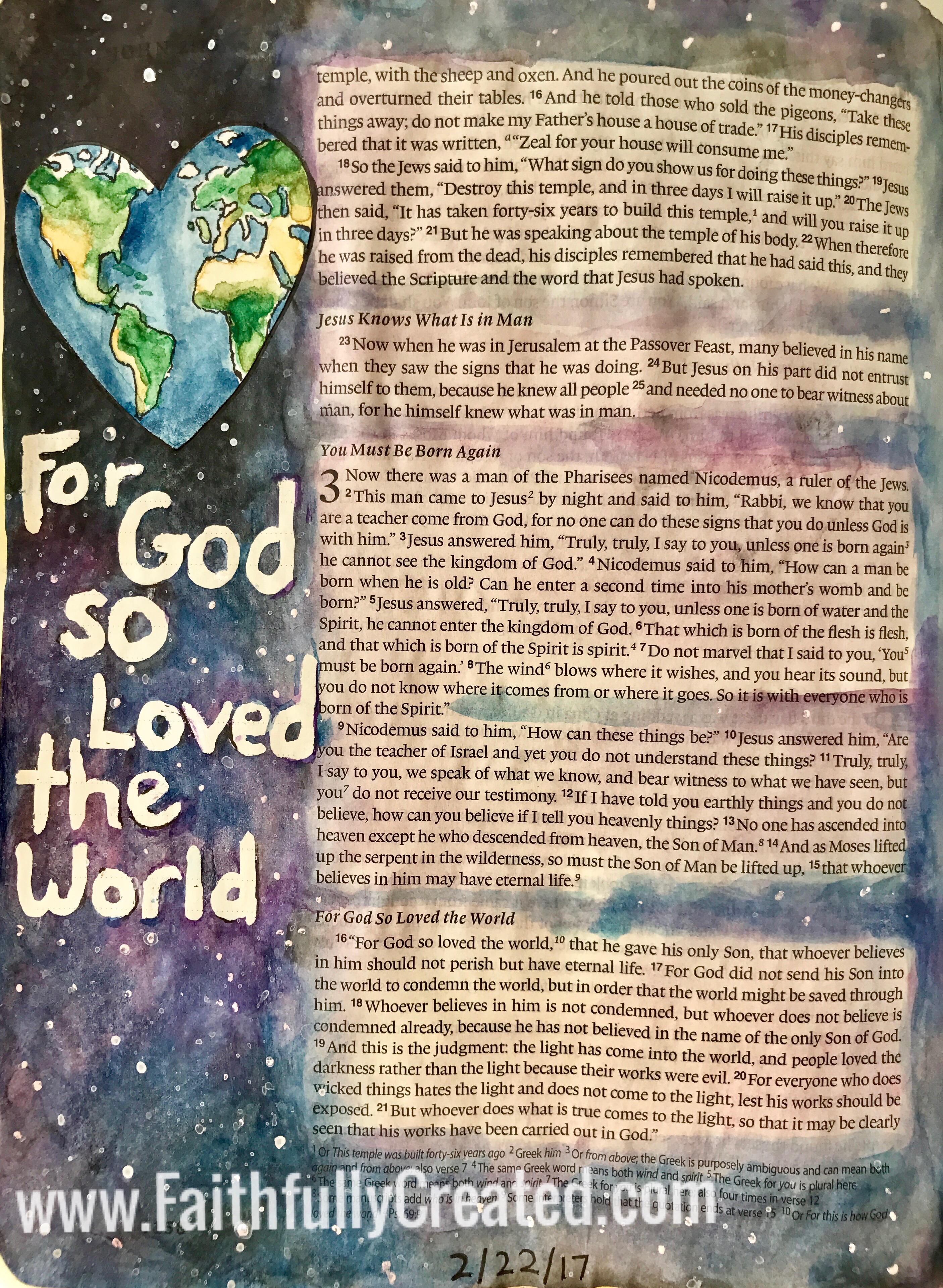 This page was created with a Molotow resist pen for the lettering, watercolors for the world and sky, the stars were splattered and a few stars (dots) added with white Uniball gel pen. The resist letters were removed with a kneadable eraser after the watercolors dried. The heart world was cut out and painted separately and glued onto the page with paper cement.